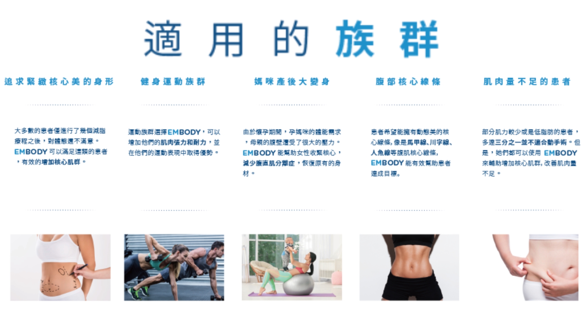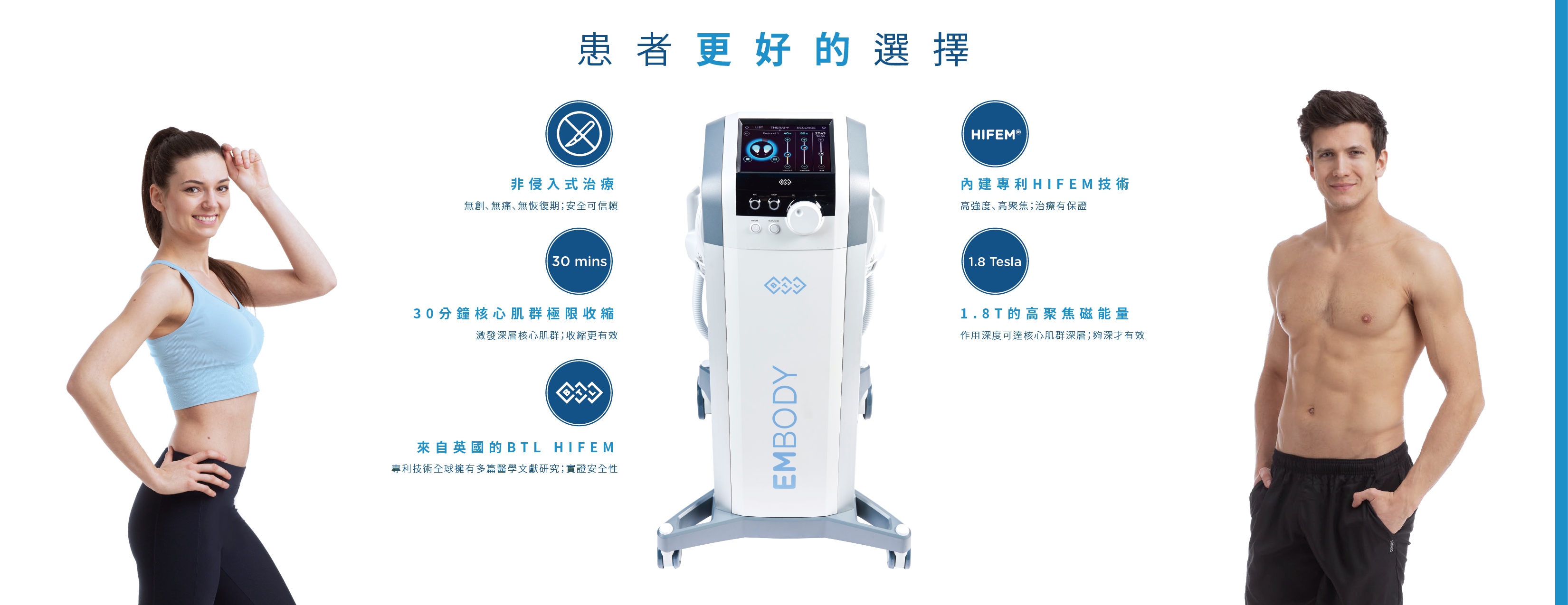 EMBODY 是現代人兼顧健康、線條與效率的全新選擇 —— 不論是想要雕塑體態、提升運動表現,或改善核心不足,皆能透過安全有效的非侵入式療程達成。