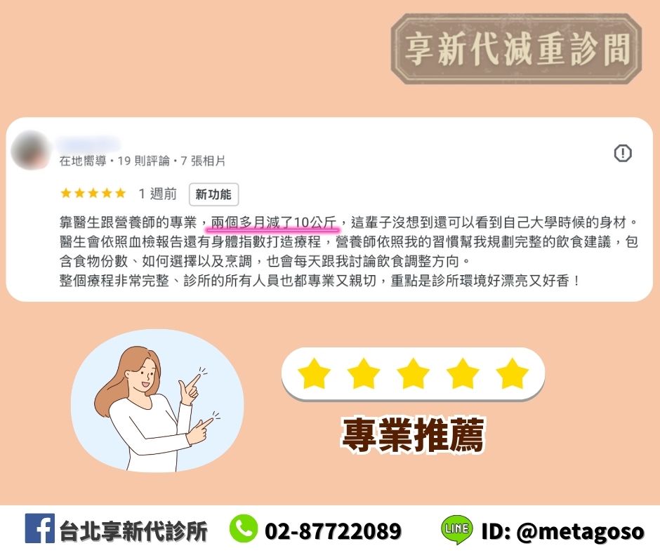 『前一陣子因為想減重去了某間診所,做完檢測後告訴我快要得糖尿病了,我跟男友都嚇了一大跳!因此想要找更專業的診所看看,幸好朋友介紹台北享新代診所