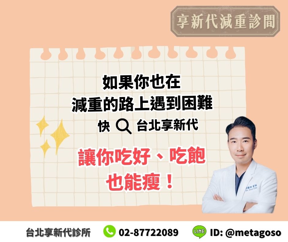 如果你也在減重的路上遇到困難,台北享新代診所會是你最值得信賴的夥伴,讓你吃好、吃飽也能瘦!