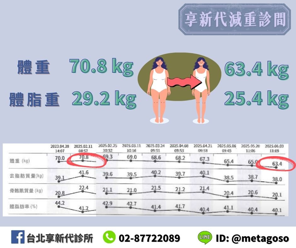 體重 減少 7.4 公斤(70.8 kg > 63.4 kg)