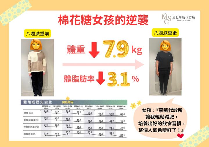 驚喜變身計畫8週減重大變身,看看這位棉花糖女孩的逆襲故事!體重減少:7.9公斤體脂肪率降低:3.1%一起來看看女孩怎麼說: 「之前曾使用過瘦瘦針,當時有瘦將近十公斤,但身體也覺得有氣無力,沒打針後,在正常進食後,體重又回復到原來的體重。來到享新代有代謝專科的醫生給予身體評估、抽血檢驗、用藥治療及減重營養師進行營養諮詢,發現吃對東西對減重真的很重要!!!診所有專門的飲食App可使用,每日上傳飲食,營養師也會針對所攝入的食物是否適當,即時給予飲食指導與建議,讓我增加對食物的選擇,同時又有正確的觀念。在這次減重中,享新代診所讓我可以輕鬆減肥又輕鬆吃,培養出自己好的飲食習慣,整個人氣色變好,體重也不再復胖」用正確的方法,讓健康與美麗同步升級!立即預約,開啟你的改變之旅!